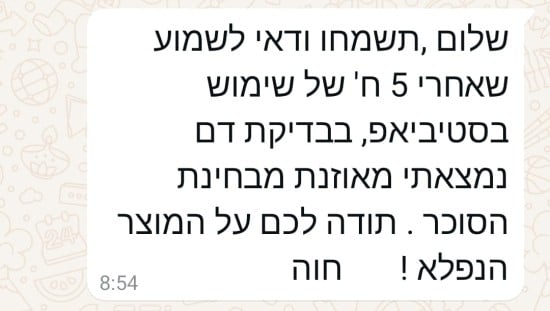 "לעומת זאת, רוב החולים שהחלו לצרוך את הסטיביאפ דיווחו על ירידה משמעותית ברמות הסוכר, שיפור ניכר בתוצאות הבדיקות והרגשה כללית טובה יותר.