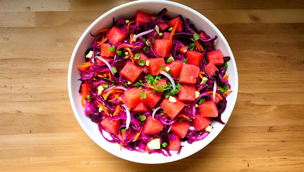 הסלט האדום הזה שובר שגרה עם קוביות אבטיח עסיסיות שמוסיפות מתיקות מרעננת ובלתי צפויה.