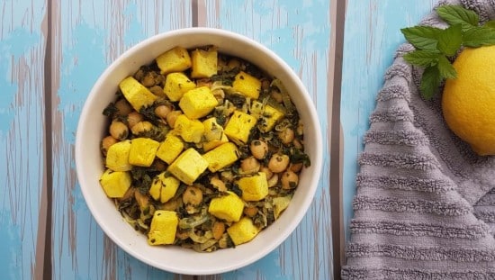 מנה חגיגית, מזינה ומלאת טעמים, שמתאימה לכולם: טופו רך עם תרד טרי, גרגירי חומוס ותיבול לימוני עדין