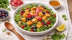 לאזן סוכרת לפי הסו-ג'וק – סלט עשבי תיבול עם פירות יער, טופו קראנץ' ושאלוט כבוש