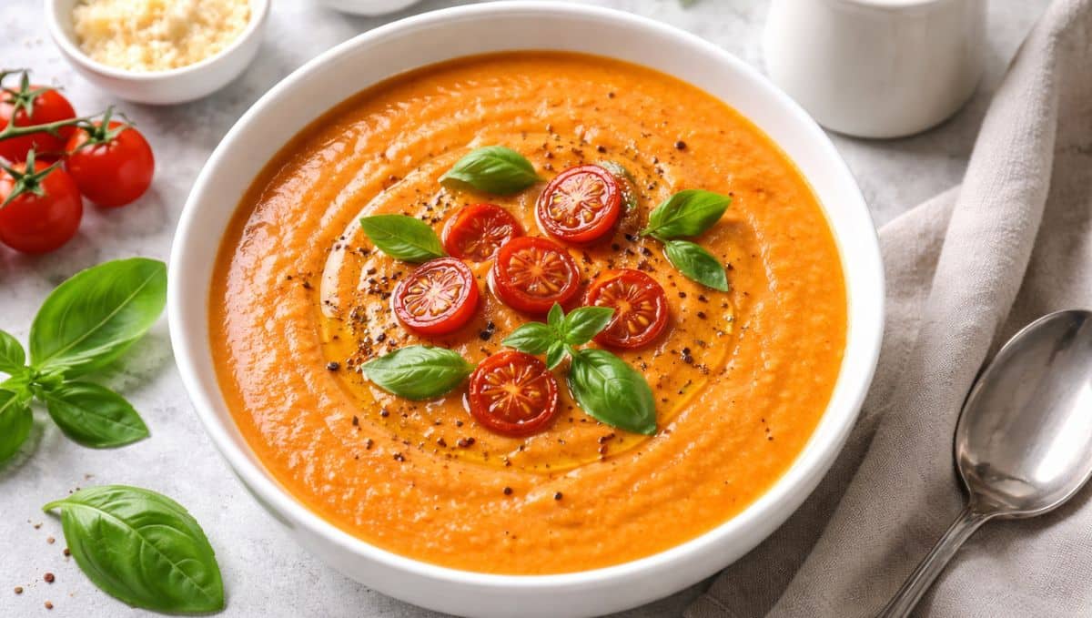 מרק עגבניות שרי עדין וקטיפתי, שבו העגבניות נצלות מראש להעצמת המתיקות והעומק, ומשתלבות למרקם חלק ומנחם שמתאים לכל עונה.