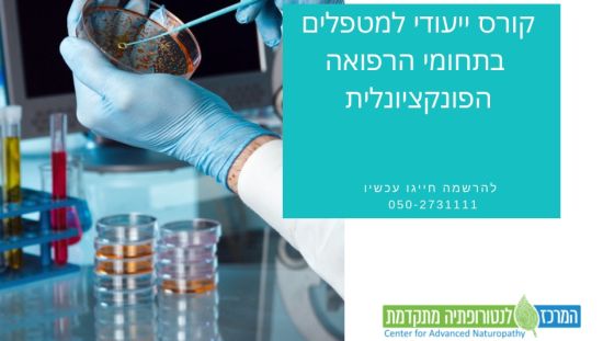 קורס ייחודי ובלעדי להכשרה מעשית לעבודה וטיפול עבור קהל המטפלים, הרופאים והעוסקים בתחום הרפואה המשלימה. הקורס היחיד בישראל המקיף את כל מעגלי הטיפול בעולם רפואת המחר-הפונקציונלית, ומעניק למשתתפי הקורס הבנה, ידע תיאורטי, כלים פרקטיים ,היכרות והתמקצעות בטיפול בפציינטים בעלי בעיות רפואיות ללא מענה ופתרונות הרפואה בישראל, ושילובם חזרה למעגל הבריאות ותפקוד יומיומי תקין.